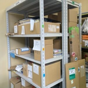 納品場所(ストックヤード)に小さめのホワイトボードを貼り、総務で受け取った人が品名を記入し発注者が消して持っていくという流れをつくった。連絡をしないため電話をする手間、発注者を探す時間、発注者が手を止めて対応する時間がなくなり、時間の短縮やミス防止につながった。