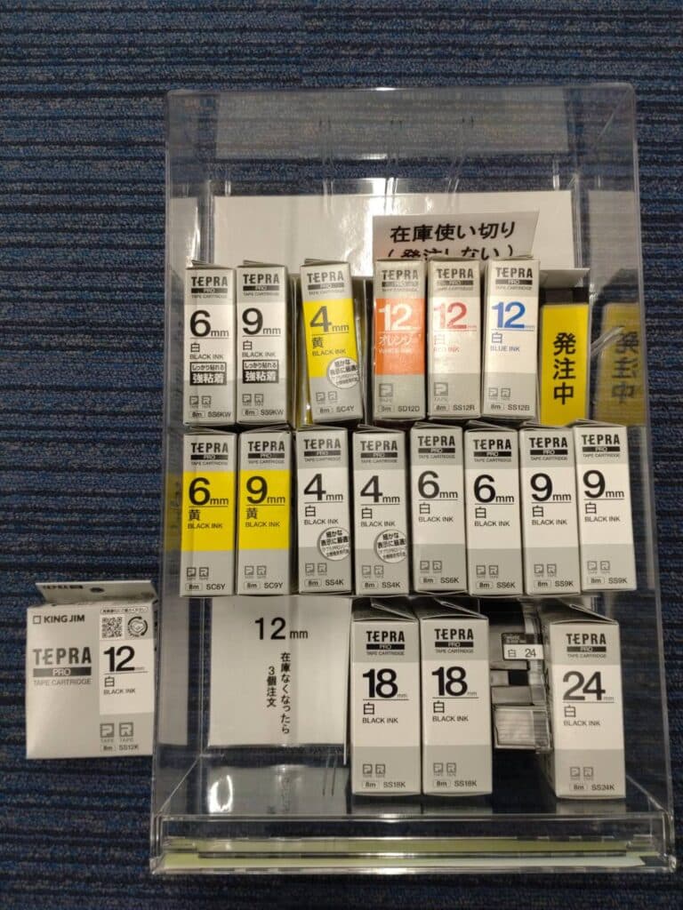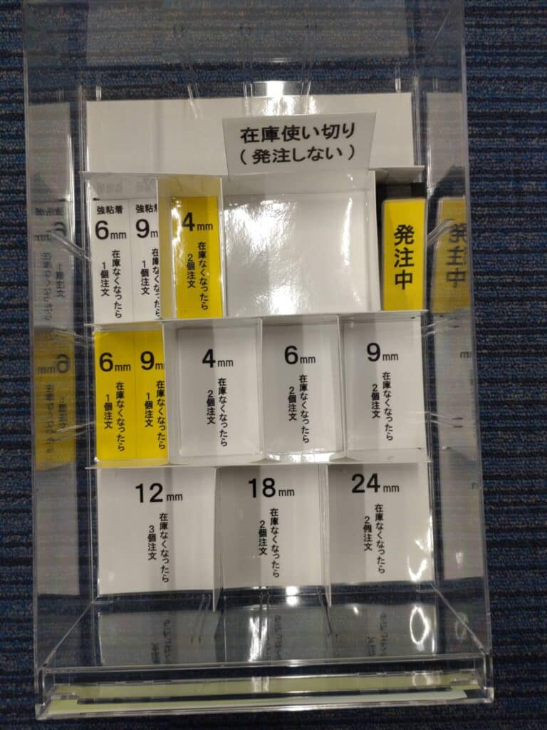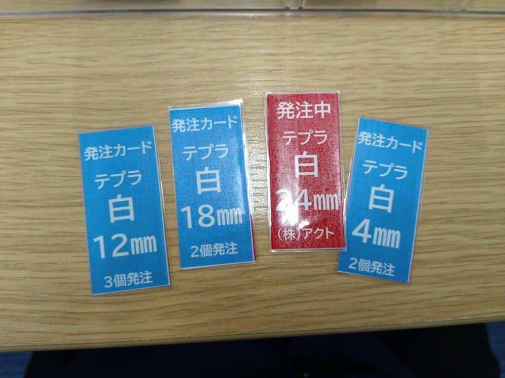 テプラ管理棚の表示と発注カードを作り直し、一目で情報が分かりやすくなるように工夫しました。